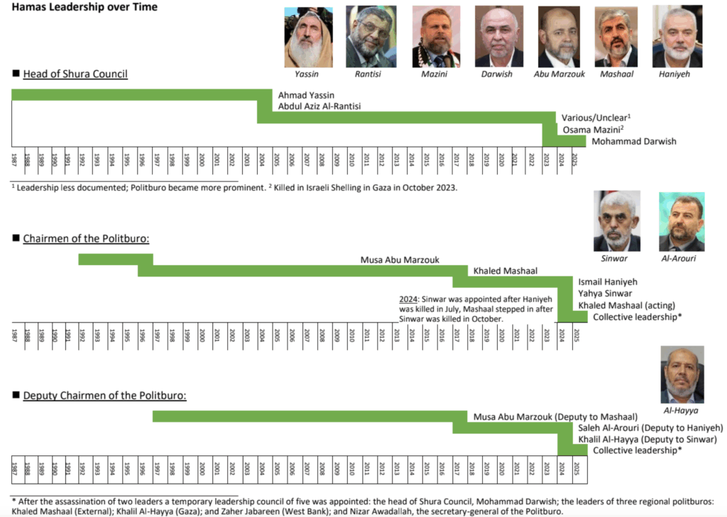 Politburo (or executive committee): Main decision-making body, elected by the Shura Council and deter-mines Hamas’s policies in consultation with it. The main politburo comprises 15 members elected by the Shura Council every four years. In May 2017, Ismail Haniyeh was elected as chairman, replacing Khaled Mashaal. Following Haniyeh’s assassination by Israel in July 2024, the Shura Council chose Yahya Sinwar as successor. After he was also killed by Israel in October 2024, a temporary “collective leadership” was set up to reduce the impact of potential future assassinations. It has 5 members: the head of Shura Coun-cil, Muhammad Darwish; the leaders of three regional politburos: Khaled Mashaal (Diaspora), Khalil Al-Hayya (Gaza), and Zaher Jabareen (West Bank); and the secretary-general of the Politburo, Nizar Awadal-lah.* Until January 2012, the politburo was based in Damascus and has since relocated to Qatar.