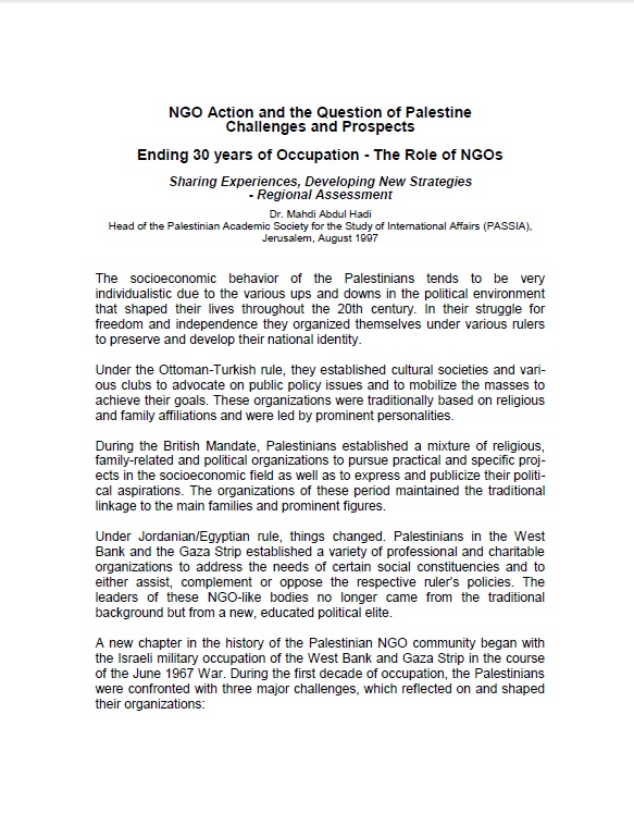 Unpublished paper presented at the UN conference on NGO Action and the Question of Palestine – Challenges and Prospects: Ending 30 years of Occupation – The Role of NGOs, August 1997